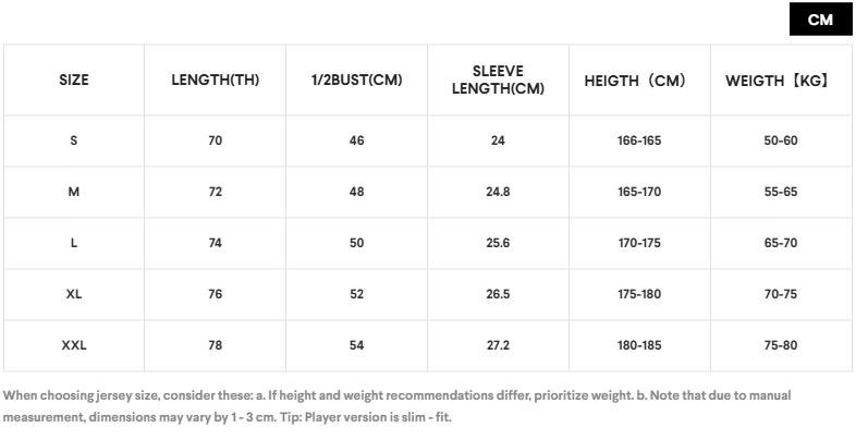 - Player Version: A slim fit with a lightweight, pro-quality fabric. It features heat-pressed details for a truly authentic, professional experience.